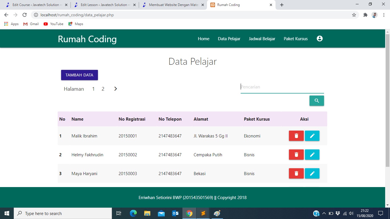 Jika sudah, save file nya. kemudian coba akses websitenya. dan buka menu Data Pelajar. Jika berhasil maka tampilannya seperti ini.