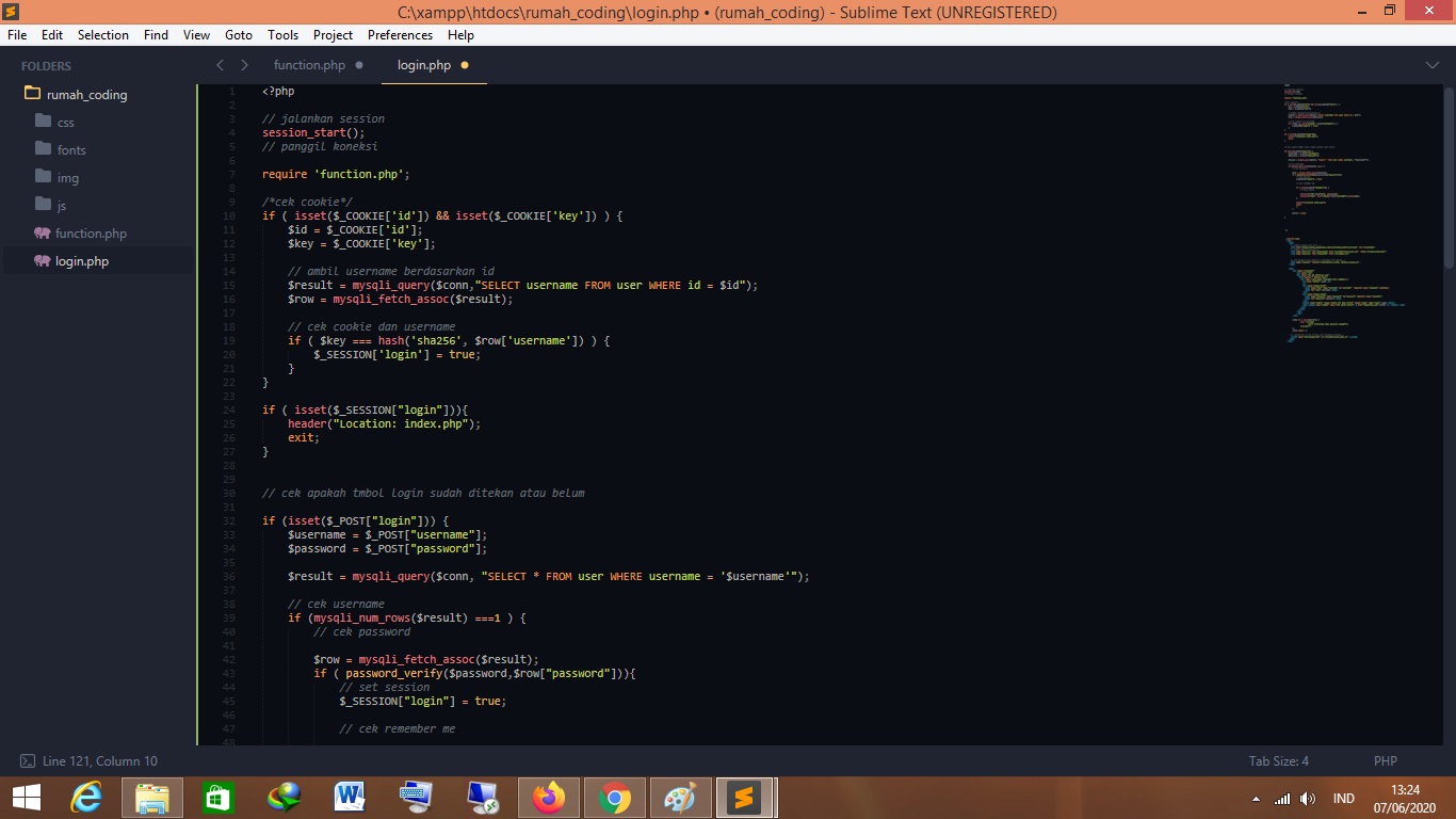 Buatlah new file di folder project “rumah_coding” dengan nama “login.php”. Pada halaman ini kita akan membuat session, cookies, dan validasi untuk tombol login. Gambar dibawah ini adalah tag php. untuk membuat session, memanggil function, cek cookies, dan validasi tombol login.