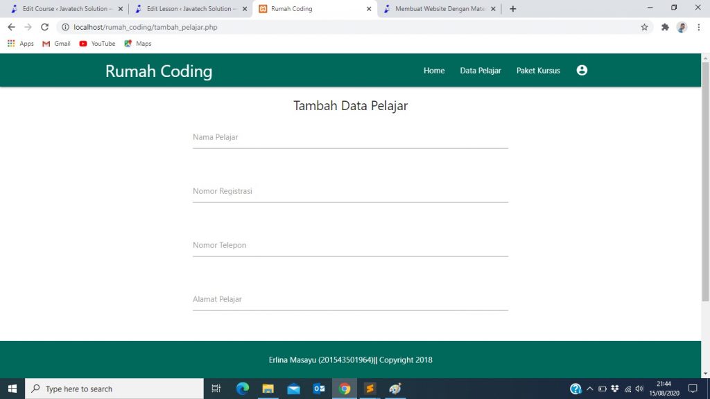 Kemudian coba akses halaman data pelajar, dan klik button tambah pelajar, kemudian lakukan penginputan data pelajar.