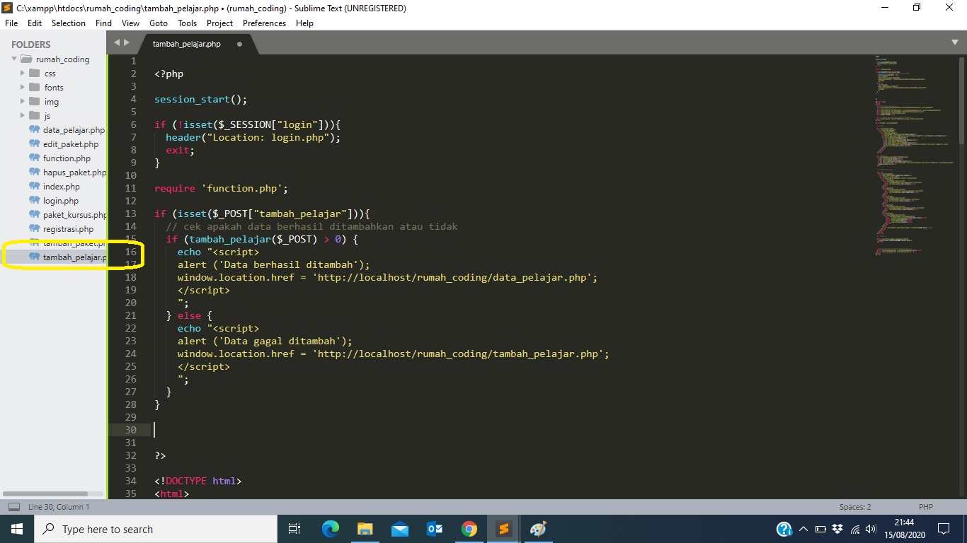 Setelah kita berhasil membuat halaman data pelajar, selanjutnya kita akan membuat halaman untuk input data pelajar. Pertama kita buat new file dengan nama “tambah_pelajar.php”.